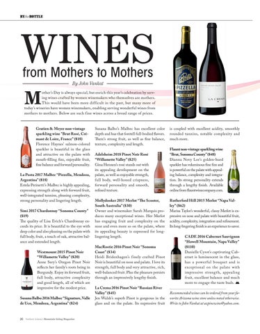 otherâs Day is always special, but enrich this yearâs celebration by serving wines crafted by women winemakers who themselves are mothers. This would have been more difficult in the past, but many more of todayâs wineries have women winemakers, enabling serving wonderful wines from mothers to mothers. Below are such fine wines across a broad range of prices. Gratien & Meyer non-vintage sparkling wine "Brut RosĂŠ, CrĂŠmant de Loire, Franceâ ($18) Florence Haynesâ salmon-colored sparkler is beautiful in the glass and attractive on the palate with mouth-filling fizz, enjoyable fruit, fine balance and forward personality. La Posta 2017 Malbec âPizzella, Mendoza, Argentinaâ ($18) Estela Perinettiâs Malbec is highly appealing, expressing strength along with forward fruit, well-integrated tannins, pleasing complexity, strong personality and lingering length. Simi 2017 Chardonnay âSonoma Countyâ ($19) The quality of Lisa Evichâs Chardonnay exceeds its price. It is beautiful to the eye with deep color and also pleasing on the palate with full body, fruit, a touch of oak, attractive balance and extended length. Westmount 2015 Pinot Noir âWillamette Valleyâ ($20) Anne Seryâs Oregon Pinot Noir reflects her familyâs roots being in Burgundy. Enjoy its forward fruit, full body, attractive complexity and good length, all of which are impressive for the modest price. Susana Balbo 2016 Malbec âSignature, Valle de Uco, Mendoza, Argentinaâ ($24)
