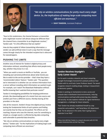 PUSHING THE LIMITS Another area of interest for Tandon is digital privacy and information retrieval, something that affects most people every day, whether they know it or not. “When you watch a movie on Netflix or YouTube, you are revealing your personal preferences about what movies you like to watch to the service provider – that’s how they have a ‘recommended videos’ feature,” Tandon said. “The question we’re interested in is whether we can retrieve information from a server without revealing which information we wanted to get. For example, can I watch The Shawshank Redemption without Netflix knowing that I watched that particular movie?” Tandon is investigating possibilities for keeping preferences private, like downloading part of a movie from one source and another part from a different source, thereby leaving all the providers in the dark. Like all his research, Tandon’s forays into digital privacy involve testing the fundamental limits of such systems and finding out exactly how far they can be pushed. The effects are farreaching: Anyone who uses the internet, even for something as simple as a Google search, is affected by big-data computing and vulnerable to potential data breaches. “We rely on wireless communications on nearly every single device,” Tandon said. “So the implications of making large-scale computing more efficient are enormous.”