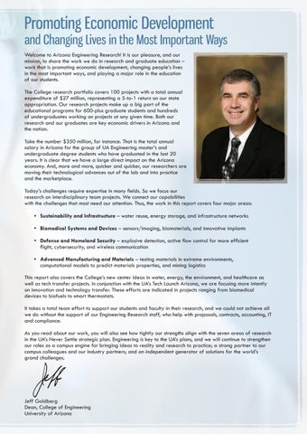 and Changing Lives in the Most Important Ways Welcome to Arizona Engineering Research! It is our pleasure, and our mission, to share the work we do in research and graduate education – work that is promoting economic development, changing people’s lives in the most important ways, and playing a major role in the education of our students. The College research portfolio covers 100 projects with a total annual expenditure of $27 million, representing a 5-to-1 return on our state appropriation. Our research projects make up a big part of the educational programs for 600-plus graduate students and hundreds of undergraduates working on projects at any given time. Both our research and our graduates are key economic drivers in Arizona and the nation. Take the number $350 million, for instance. That is the total annual salary in Arizona for the group of UA Engineering master’s and undergraduate degree students who have graduated in the last 20 years. It is clear that we have a large direct impact on the Arizona economy. And, more and more, quicker and quicker, our researchers are moving their technological advances out of the lab and into practice and the marketplace. Today’s challenges require expertise in many fields. So we focus our research on interdisciplinary team projects. We connect our capabilities with the challenges that most need our attention. Thus, the work in this report covers four major areas: