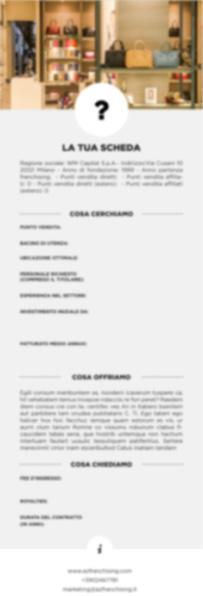 “Imprenditore con pregressa esperienza significativa nel settore retail. Fiducioso ed entusiasta verso il prodotto e il brand. Con una adeguata propensione all’investimento supportata da solida affidabilità finanziaria. Interessato ad instaurare una relazione commerciale fondata su una partnership leale, reciprocamente produttiva e di lungo periodo”.