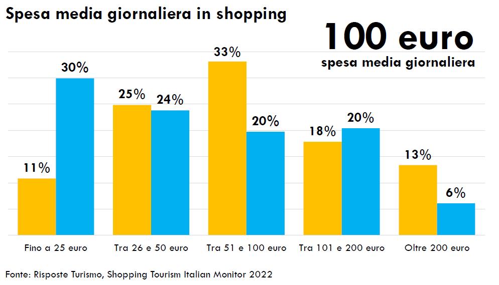 La spesa media pro-capite giornaliera in acquisti da parte dei turisti italiani dello shopping è pari a 110 euro e il 77% degli shopping tourist italiani intervistati ha visitato luoghi, laboratori e aziende di produzioni tipiche locali. I negozi del centro storico e le vie dello shopping sono i luoghi di acquisto preferiti (70%), davanti alla coppia outlet-centri commerciali (entrambi con il 53% delle preferenze) e ai mercati (34%). Dall’analisi emerge inoltre come siano ancora sottoutilizzati servizi come gli shopping tour (25%), il tax refund (22%) o il ricorso ad un personal shopper (17%), con circa il 40% dei non fruitori ad esserne però interessato. Le opportunità dell’investire in