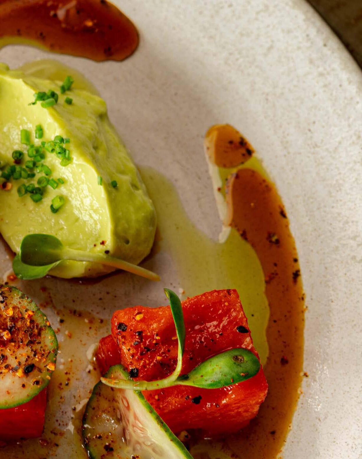 guests. The mouthwatering, soycured watermelon is supported by an impeccable selection of companions, like a superb foursome. Thinly sliced refrigerated pickles are precisely placed on each cube of watermelon, no two the same – providing a refreshing, yet splendid acidic accent to the sweetness of the melon. As the watermelon rests in a basin of its own nectar, a quenelle of vibrant, limed avocado mousse furnishes a feathery accessory to the smattering of textures on the plate. Lastly, togarashi (the Japanese blend of seven spices) dusts the plate to finalize one of the most satisfying items on the brief menu.