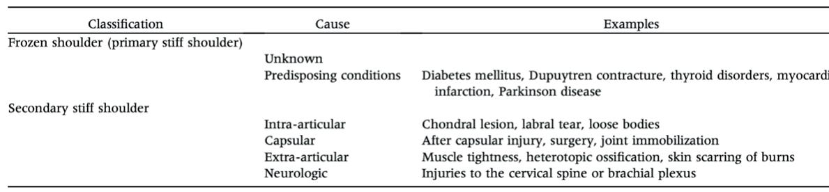 Tegenwoordig komt men overeen dat de groep stijve schouders op te delen is in primaire idiopatische stijve schouders en secundaire stijve schouders.