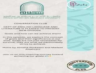 IncontinuationofthePodcastepisodes’serieswhichwasinitiatedin the academic year 2022, conversation club released episode-11 on 18th of March 2025, titled “Goals-How can we achieve them”. In this episodeweexploretheconceptofgoalsandtheirsignificanceinour lives Goals are not just necessities for survival; they are what we passionately strive to achieve. Podcast series was hosted by Maha Almkawni and Madawi Al qahtani, and edited by Norah Ibrahim Almuhaini