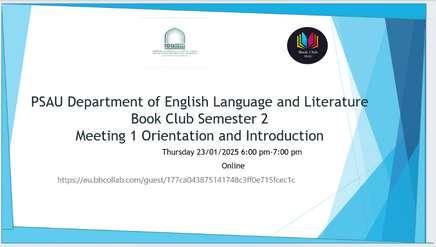The PSAU Book Club, Department of English Language and Literature , College of Science and Humanities tries to bring students of different level together to cooperate and have a delightful reading experience and make reading a lifelong habit The Book Club had its meetings online from 28 August 2024 to 16 September 2024 there were 12 participants from levels 3 to level 7