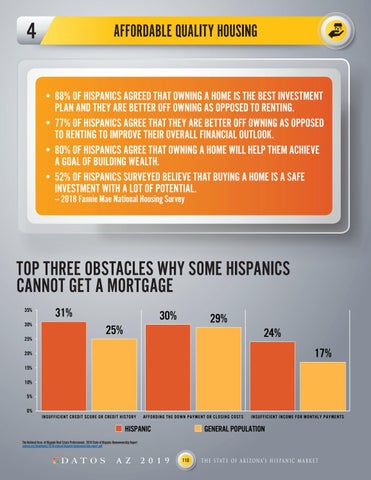 • 88% OF HISPANICS AGREED THAT OWNING A HOME IS THE BEST INVESTMENT PLAN AND THEY ARE BETTER OFF OWNING AS OPPOSED TO RENTING. • 77% OF HISPANICS AGREE THAT THEY ARE BETTER OFF OWNING AS OPPOSED TO RENTING TO IMPROVE THEIR OVERALL FINANCIAL OUTLOOK. • 80% OF HISPANICS AGREE THAT OWNING A HOME WILL HELP THEM ACHIEVE A GOAL OF BUILDING WEALTH. • 52% OF HISPANICS SURVEYED BELIEVE THAT BUYING A HOME IS A SAFE INVESTMENT WITH A LOT OF POTENTIAL. — 2018 Fannie Mae National Housing Survey