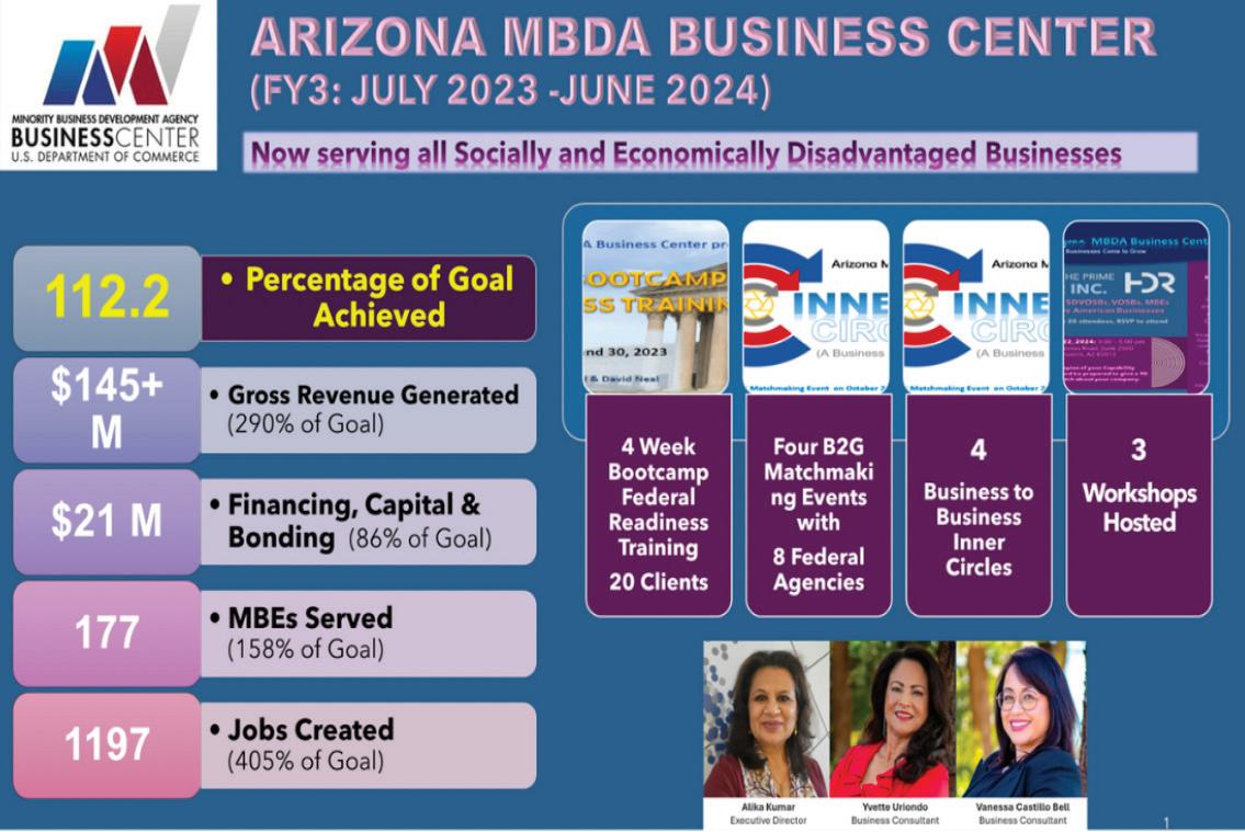 Yvette Uriondo brought a wealth of experience in helping clients access capital and build strategic community partnerships. Her expertise was instrumental in connecting businesses with the resources they needed to expand. Vanessa Castillo Bell showcased her passion for helping businesses grow through her personalized, client-centered approach. As our “media queen,” she ensured the Center’s visibility remained high, keeping us relevant and connected with the broader community. Alika Kumar, a focused and goal-oriented leader, organized highly anticipated Businessto-Business and Business-to-Government matchmaking events, recruited subject-matter experts for workshops, built strong partnerships, and introduced new programs and events. Together, this dynamic team provided impactful and comprehensive support for socially and economically → disadvantaged clients across Arizona.