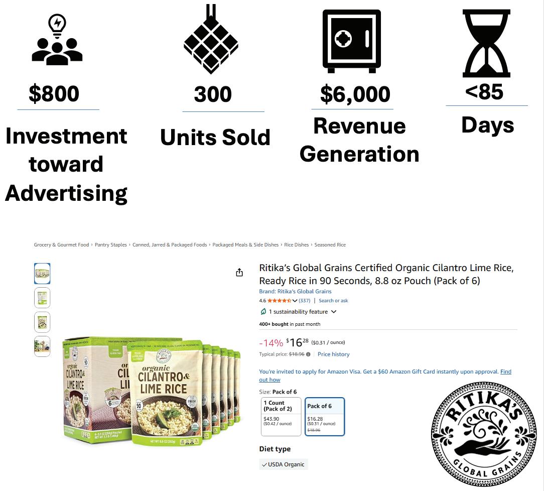 Guillermo Gamez-Cordova, our eCommerce Manager & Business Consultant was able to assist our client, Ritika’s Global Grains with getting their product on Amazon. Ritika used every element of our Chamber’s CRP services, and Guillermo provided enhanced one-onone consulting as well as end to end eCommerce Support, including assisting with effective keywords and advertising strategies. He was able to assist with launching their ad
