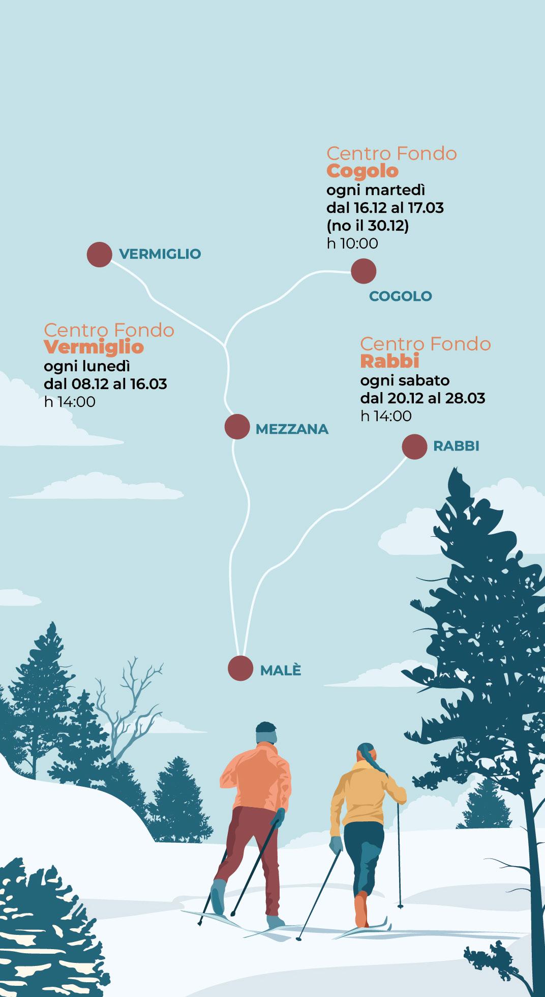 lunedì Vermiglio h 14:00 | martedì Cogolo h 10:00 | sabato Rabbi h 14:00 dall’8 dicembre 2025 al 28 marzo 2026