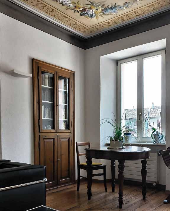 pur abbinando interventi attuali e sostenibili per renderla adatta alle moderne esigenze abitative, lo si ritrova in ogni dettaglio. Dettagli che anche i tre bambini tengono a mostrarci, fornendo spontaneamente un bell’esempio di coinvolgimento e sensibilizzazione dei più giovani. Aggiunge il proprietario: «Di fronte a una casa vecchia e malandata non bisogna limitare lo sguardo a ciò che si vede, ma cercare piuttosto di immaginare come può diventare dopo un intervento adeguato. Con questa visione abbiamo recuperato anche alcuni mobili in legno, come lo Stammtisch del ristorante, senza aggiungere altri pezzi d’epoca estranei alla casa. Per le nuove componenti dell’arredo, come la libreria, è stato scelto il colore bianco per garantire un accostamento neutrale». Il restauro conservativo di Ca’ dal Geni, progettato dallo Studio Ivo Trümpy-Aurelio Bianchini, è stato un elemento essenziale per la sua accettazione in Domus Antiqua Helvetica che privilegia il carattere degno di protezione di un edificio piuttosto che la sua età. Nell’elenco figurano pertanto costruzioni di diverse epoche, alcune con una storia di più secoli. Ne è un esempio l’abitazione risalente al Settecento del presidente Gianfederico Pedotti, una campagne (dimora all’epoca a uso estivo) alla quale dedica grande cura per preservarne «la sostanza, l’anima e il carattere, mantenendo in vita storie e tradizioni».