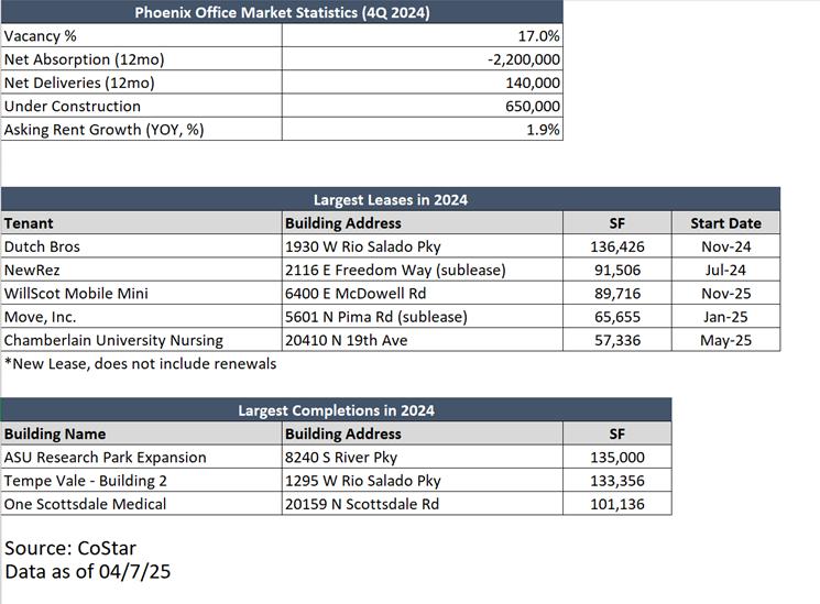 Conditions in the Phoenix office market remain dislocated. Users continue to scrutinize the effective use of their footprints, often resulting in space reductions or closures. Additionally, job growth has been sluggish in traditionally office-using employment sectors for over two years. This lowering of underlying space demand caused vacancy to climb more than 550 basis points since 19Q4.