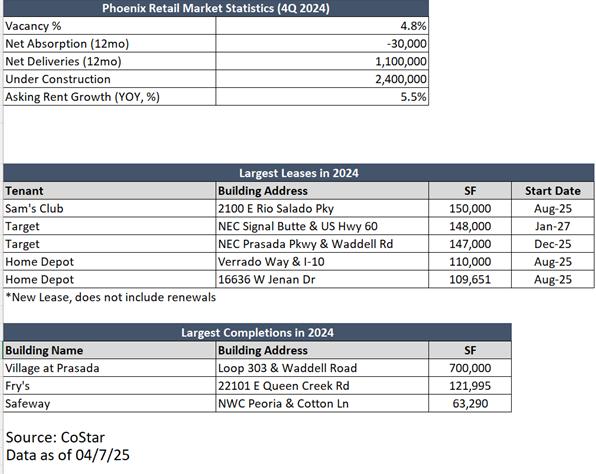 Underlying demand in the Phoenix retail market remains strong, though a more nuanced picture of space market conditions has emerged. While a pick-up in store closures caused net absorption to decelerate last year, fundamental tightness persists as 2025 kicks off. Broadly speaking, competition for available space is elevated as robust net migration, steady job growth, and rising incomes encourage expansion. These stout demand drivers, coupled with the modest construction pipeline, have kept availability low and rent growth elevated.