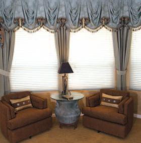 • Fabric stacks at the top of the window, reminiscent of a custom Roman shade.