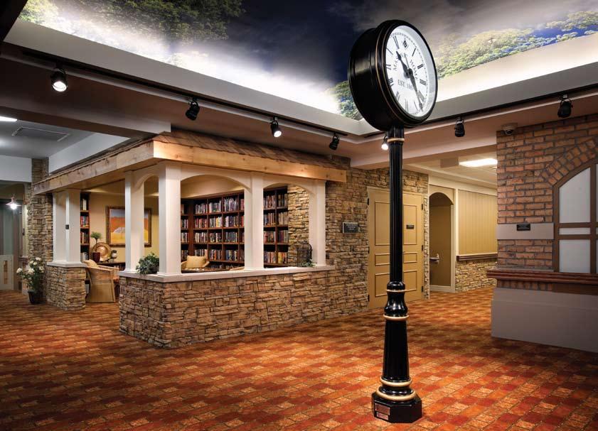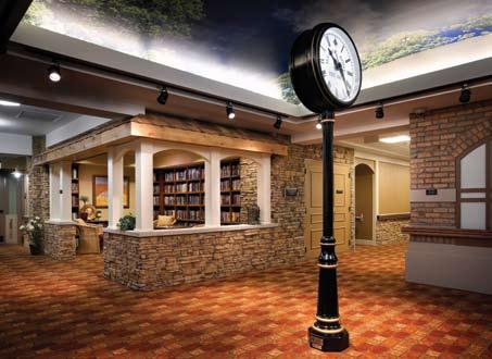 From my perspective as a nurse and now as an interior designer of healthcare facilities, the now widely accepted “trend” of providing only private rooms has been one of the most important changes in the healthcare environment. Research has documented that patients or residents experience more privacy, use less pain and/or sleeping medications, have improved communications with the healthcare team, and acquire less infections. As a result, patients have shorter stays in acute care and less risk for hospital admission for long-term residents. In the photograph of The Masonic Homes of Kentucky, the design of the assisted living resident room offers excellent access to daylight through a bay window and nature as well as a “residential” style of environment with artwork and seating that serves as the resident’s home. The photograph of the clock tower is also from the Masonic Homes of Kentucky. This clock is centrally placed and effectively serves many purposes within the facility. It serves as a memorable wayfinding tool for residents and visitors as well as orientation to time for residents. Research documents the value of using memorable elements for wayfinding. This is especially helpful for residents who have memory issues or Dementia. The library serves as a gathering space, a social outlet and offers seating and tables for residents to participate in a group activity. The unique ceiling treatment in the corridor above the clock is also a memorable element and valuable for wayfinding.