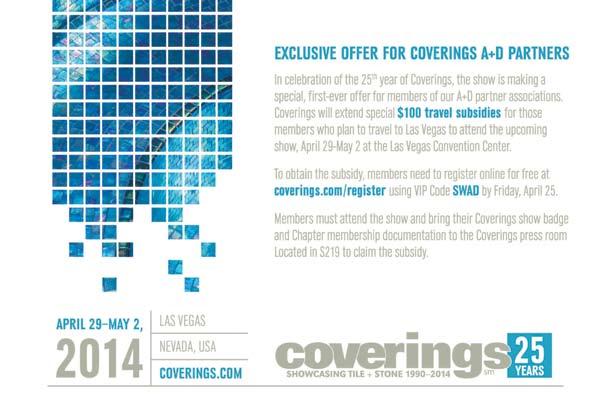29 – May 2 Coverings Conference –Las Vegas Convention Center. Arizona north Chapter is a co-sponsor of Coverings. Randy Fiser, CeO of ASID, will be speaking on April 30, “State of the Design Industry”