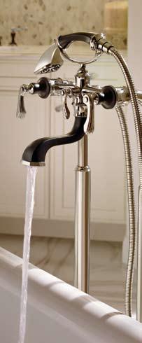 The CharlotteTM Bath Collection by Brizo® infuses clean lines with classical elegance, deftly bridging the gap between traditional and modern design. The Charlotte two-handle freestanding tub filler makes a statement with sumptuous curves and exquisite details. Four stunning finishes— including Cocoa BronzeTM with Polished Nickel—are available to complement any décor.
