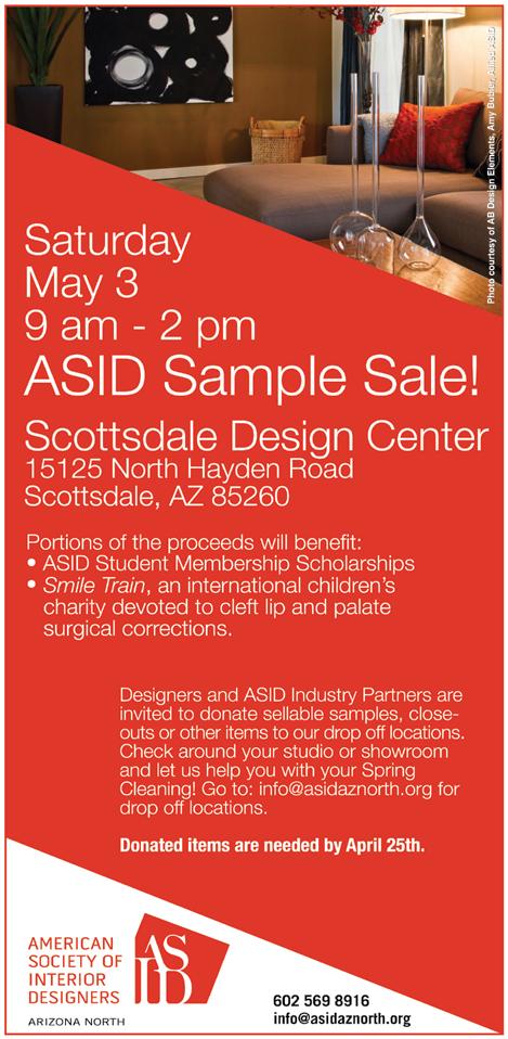 3 AsiD sample sale – Scottsdale Design Center 9 am–2 pm, 15125 n. Hayden Road, Scottsdale, 85260