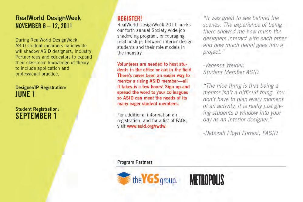 Linda: ThroughmembershipinASID,Iincreasedmyproductknowledge andtrendsawareness;throughchapterleadership,Igainedabetterunderstandingofthedesigncultureandanappreciationofthelargerdesigncommunity.ThestrategicplanningtrainingprovidedbyASIDisapplicableinall areasofmybusiness.