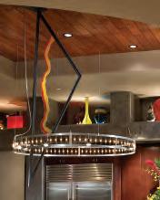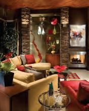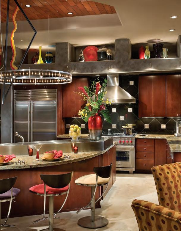 Marcia Graber, Allied Member ASID , of Graber Designs, LLC, incorporated many of these elements in the customdesigned chandelier pictured in the center photo, page 10. As a lighting design instructor for Phoenix College, Ms. Graber is both very knowledgeable and comfortable with lighting requirements and design elements. In cooperation with both Hinkley’s Lighting and Clear Concepts Interior Glass, Ms. Graber used a contemporary commercial track lighting element from Bruck, and adapted it into a circle that incorporates both festoon lamps and low voltage directional MR16 lamps. Ms. Graber then incorporated a custom-designed lit triangular art glass that transects the center of the chandelier and provides reflected light. Modifying an existing component enabled Ms. Graber to provide a unique fixture that that still met budget constraints.