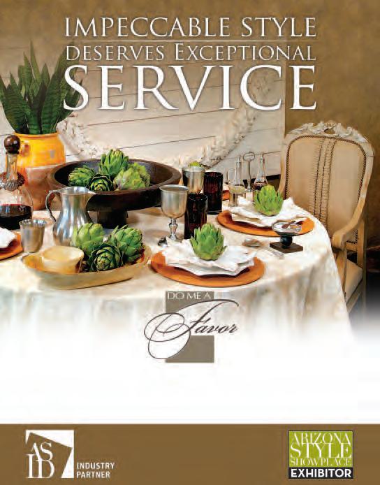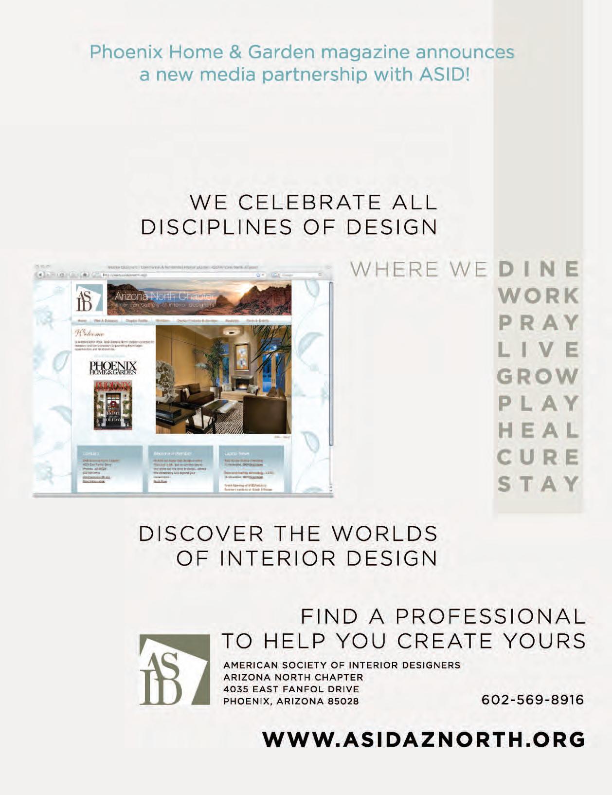 DesertDesign magazineispublishedquarterlyfortheASID ArizonaNorthChapteroftheAmericanSocietyofInterior DesignersbyDSAPublishing&Design,Inc.Editorialcontent andthe DesertDesign magazinearecontrolledandowned bytheArizonaNorthChapterofASID.Reproductionofthis publicationinwholeinpart,inanyformisstrictlyprohibited withoutthewrittenpermissionoftheArizonaNorthChapter ofASID.