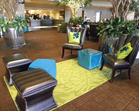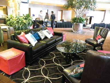 twelve-foot vertical banners with hand-painted fashion illustrations on the surrounding pillars offered major impact; large tree pots dressed in skirts of a wild metallic fabric offered a bit of bling. Existing furniture slipped into colorful fabric covers and additional selected pieces gave the space a “cool” factor.