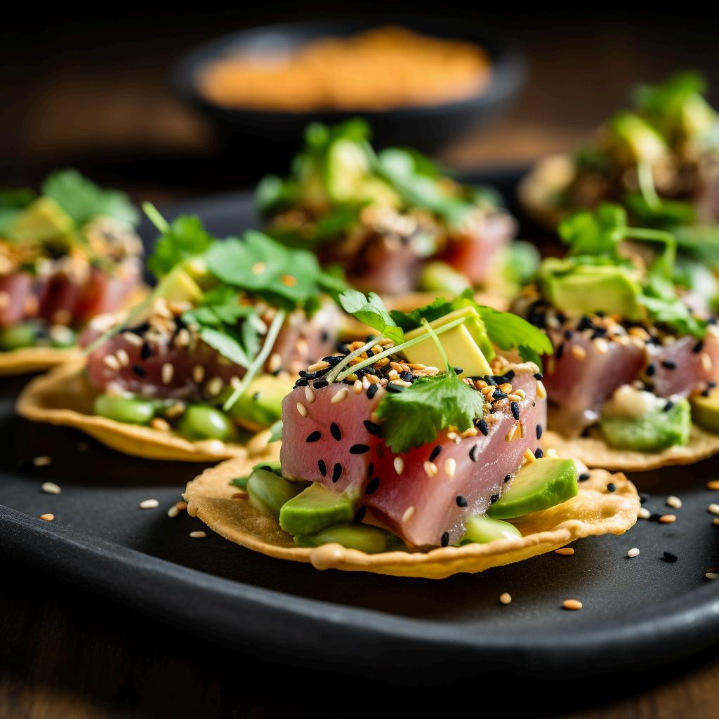 �� Tartare de thon rouge mariné au citron vert, relevé de sésame noir et blanc, dressé sur une tostada de maïs croustillante Garniture d’avocat frais, coriandre et mayonnaise chipotle