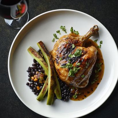 Suprême de volaille fermière rôti, sauce douce au piment guajillo, purée de haricots noirs & nopal confit