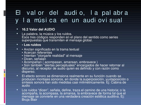 16.2 Valor del AUDIO La palabra, la música y los ruidos. Esos tres códigos responden en el plano del sentido como series superpuestas que transmiten el mensaje global. • Los ruidos • Anclan significado en la trama textual • Acercan referentes • Intentan "otorgarle realidad" al mensaje • Dicen, señalan • Acompañan ( acompasan, amansan, embravece ) • Son también "alertas perceptuales" encargados de hacer retornar al discurso, al receptor de audio quien es definido y con razón como disperso. El efecto sonoro se dimensiona realmente en su función cuando se producen montajes sonoros, en donde la superposición, yuxtaposición o síntesis sonora han sido medidas casi milimétricamente. Ej: Cabina de audio Los ruidos “dicen”, señala, define, traza el camino de una historia; o la acompaña, la acompasa, la amansa, la embravece de forma tal que el mensaje se convierte en una verdadera creación estética auditiva. Ej: Bruja Blair