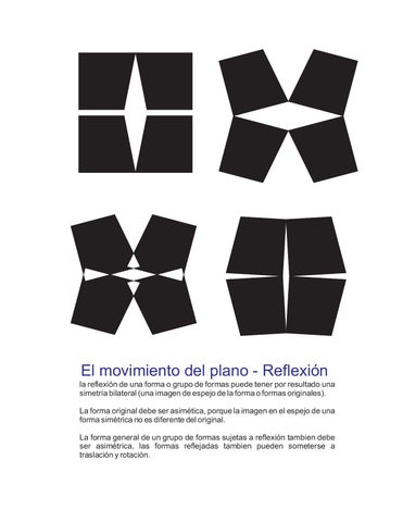 El movimiento del plano - Reflexión la reflexión de una forma o grupo de formas puede tener por resultado una simetría bilateral (una imagen de espejo de la forma o formas originales). La forma original debe ser asimética, porque la imagen en el espejo de una forma simétrica no es diferente del original. La forma general de un grupo de formas sujetas a reflexión tambien debe ser asimétrica, las formas reflejadas tambien pueden someterse a traslación y rotación.