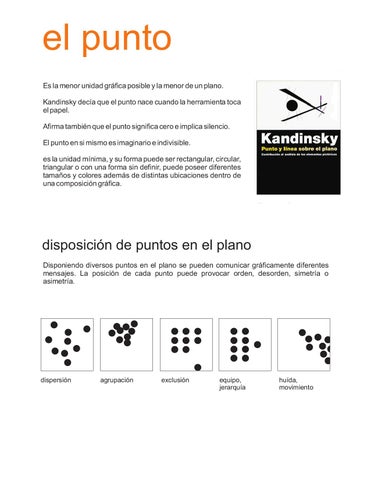 el punto Es la menor unidad gráfica posible y la menor de un plano. Kandinsky decía que el punto nace cuando la herramienta toca el papel. Afirma también que el punto significa cero e implica silencio. El punto en si mismo es imaginario e indivisible. es la unidad mínima, y su forma puede ser rectangular, circular, triangular o con una forma sin definir, puede poseer diferentes tamaños y colores además de distintas ubicaciones dentro de una composición gráfica.