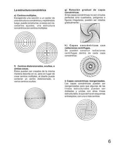i) Capas concéntricas reorganizadas. Las capas concéntricas pueden ser reorganizadas para que algunas de las líneas estructurales puedan ser dobladas y unidas con otras líneas estructurales, lo que deriva en esquemas entretejidos, con uno o más centros: