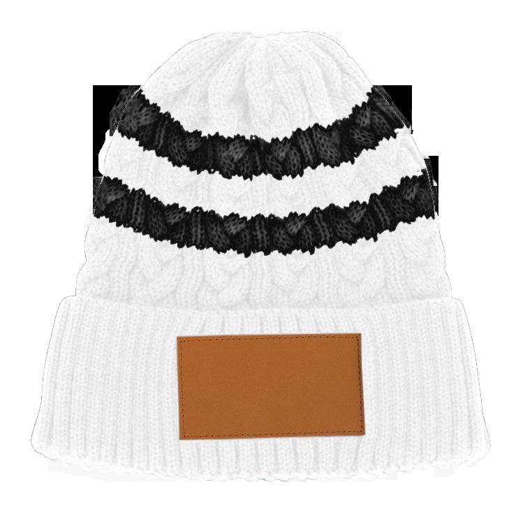 These high-end cable-knit beanies are the epitome of class. They have a debossed leather patch woven on the front, with completely custom patterns and colors. The choice is yours on if you want a fur pompom, regular pompom or no pompom. You also have the option to get these with a cuff or no cuff.
