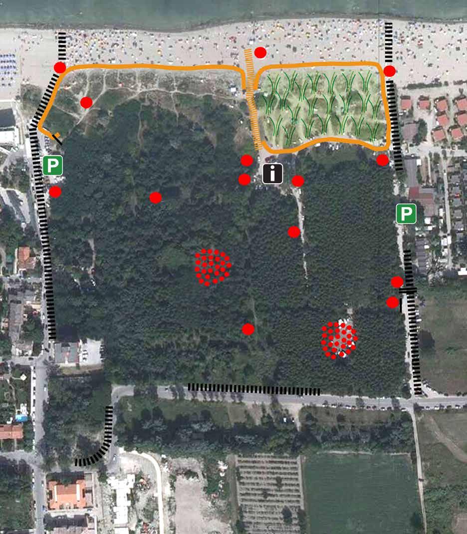 Una passerella di collegamento tra spiaggia e pineta costituisce l’unica direttrice di attraversamento dei sistemi ambientali. Questa infatti si disperde all’interno della pineta e solamente la presenza di alcuni elementi fisici, “scoglicomunicativi” che indicano punti informativi, zone di sosta, attività didattiche o culturali aiuterà i fruitori nell’orientamento.