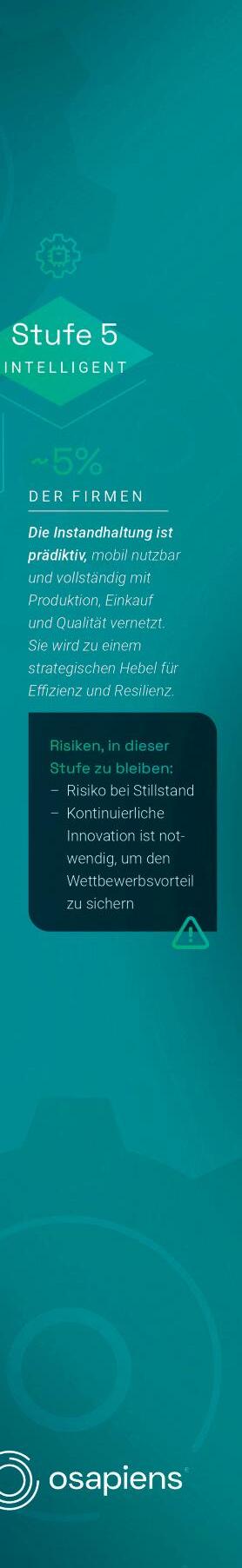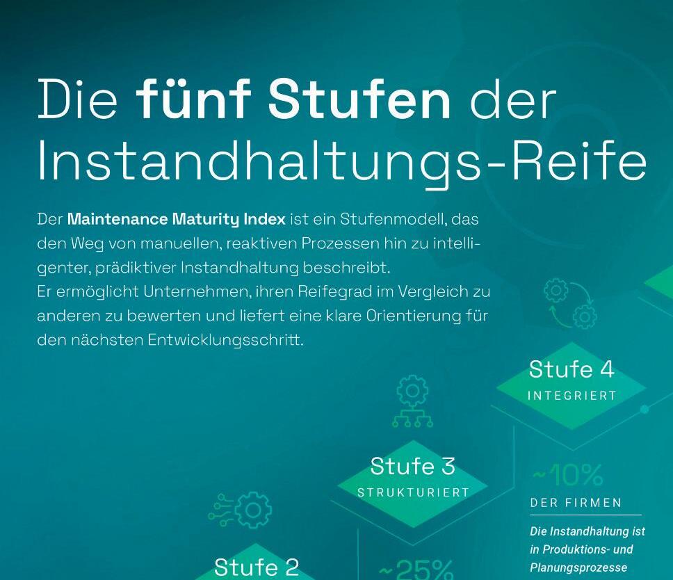 Rund ein Drittel der europäischen Unternehmen befindet sich aktuell auf Stufe 2 und hat grundlegende digitale Werkzeuge eingeführt Ein weiteres Viertel nutzt strukturierte Systeme wie CMMS- oder ERP-Module (Stufe 3) Erst 15 Prozent haben einen höheren Reifegrad erreicht: Zehn Prozent integrieren die Wartung bereits in die Produktionsplanung (Stufe 4), fünf Prozent ver fügen über prädiktive Systeme. Das Modell bietet damit nicht nur eine Standortbestimmung, sondern auch eine Orientierung, wie Unternehmen schrittweise von manuellen zu vernetzten Prozessen gelangen können