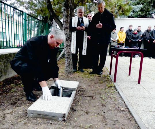 A kapszulába belekerült a jelenleg iskolába járó ösz szes osztály fényképe névsorral feltüntetve, a diákok gondolataival ellátva, az intézmény összes dolgozójá nak névsora. Elrejtettek benne egy régi iskolai logóval ellátott pólót, az iskola új nevével ellátott golyós tollat, az utókor számára írt levelet, kulcstartót, fényképeket az intézmény életéről, to vábbá egy pendrive-ot, amely az iskola alapdokumentumait tartalmazza. Húsz év múlva, az iskola ötvenedik születésnapja alkalmából lehet majd a kapszulát kinyitni. A névadó neve napját és a kerek születésnapot megünnepelve Lavaj Árpád igazgató helyezte el az Ady Endre úti épület udvarán kialakított üregbe az iskolai ereklyékkel megpakolt kapszulát, amelyet Turai János kanonok-plébános és Dóbiás Zalán esperes áldott meg. (zábrádi) Fotó: Sümegi Tamás