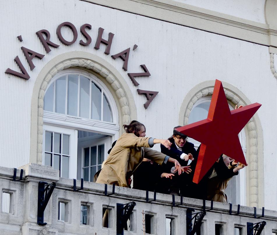 A program a Civitas Fortissima téren folytatódott, ahol a fiatalokból álló Ke let-Nyugati Alkotóműhely utcaszínhá zi előadása elevenítette fel az 56-os for radalom pillanatait, akikkel a vendégek együtt vonultak át a megemlékezés helyszínére, a Bajcsy-Zsilinszky utcai emlékműhöz. Itt Csach Gábor polgár mester mondott beszédet és idézte fel a városi eseményeket, majd a résztvevők elhelyezték az emlékezés koszorúit.