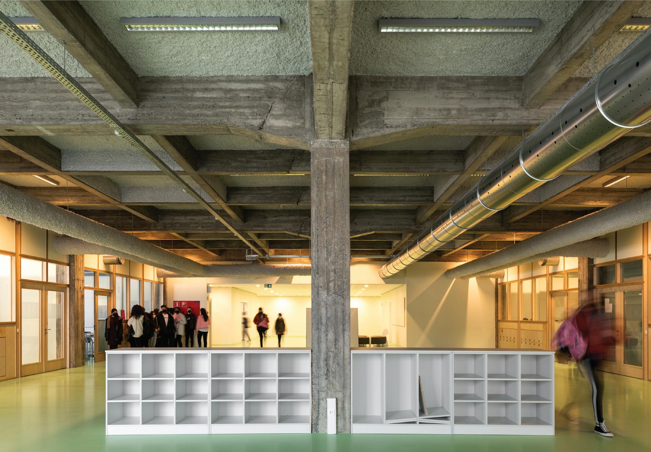 → De architecten ontwierpen klassen van 50 m2, gescheiden van grotere, meer informele ruimtes, door wanden in glas en berkenmultiplex. Gemotiveerd om de hoge plafonds en de typische wafelstructuur te vrijwaren, werkten ze met gelijmde papiervlokken tussen de balken en zichtbare technieken.