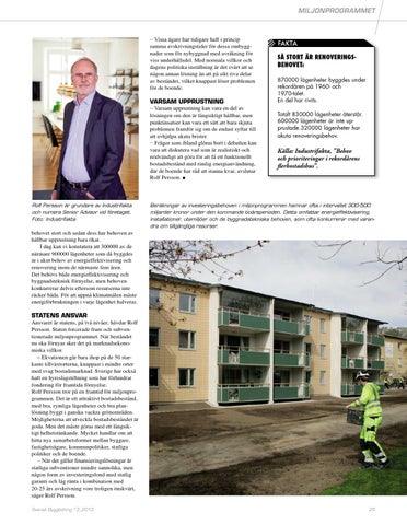 behovet stort och sedan dess har behoven av hållbar upprustning bara ökat. , GDJ NDQ YL NRQVWDWHUD DWW DY GH närmare 900000 lägenheter som då byggdes är i akut behov av energieffektivisering och renovering inom de närmaste fem åren. Det behövs både energieffektivisering och byggnadsteknisk förnyelse, men behoven konkurrerar delvis eftersom resurserna inte räcker båda. För att uppnå klimatmålen måste energiförbrukningen i varje lägenhet halveras. STATENS ANSVAR Ansvaret är statens, på två nivåer, hävdar Rolf Persson. Staten forcerade fram och subventionerade miljonprogrammet. När beståndet nu ska förnyas sker det på marknadsekonomiska villkor. – Ekvationen går bara ihop på de 50 starkaste tillväxtorterna, knappast i mindre orter med svag bostadsmarknad. Sverige har också haft en hyreslagstiftning som har förhindrat fondering för framtida förnyelse. Rolf Persson tror på en framtid för miljonprogrammen. Det är ett attraktivt bostadsbestånd, med bra, rymliga lägenheter och bra planlösning byggt i ganska vackra grönområden. Möjligheterna att utveckla bostadsbeståndet är goda. Men det måste göras med ett långsiktigt helhetstänkande. Mycket handlar om att hitta nya samarbetsformer mellan byggare, fastighetsägare, kommunpolitiker, statliga politiker och de boende. í 1lU GHW JlOOHU ¿QDQVLHULQJVO|VQLQJDU lU statliga subventioner mindre sannolika, men någon form av investeringsfond med statlig garanti och låg ränta i kombination med 20-25 års avskrivning vore troligen önskvärt, säger Rolf Persson. Svensk Byggtidning nr3_2013