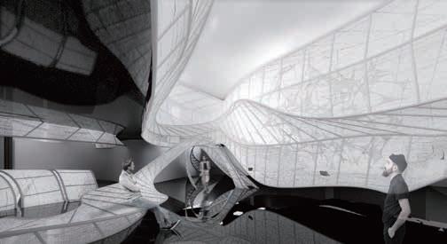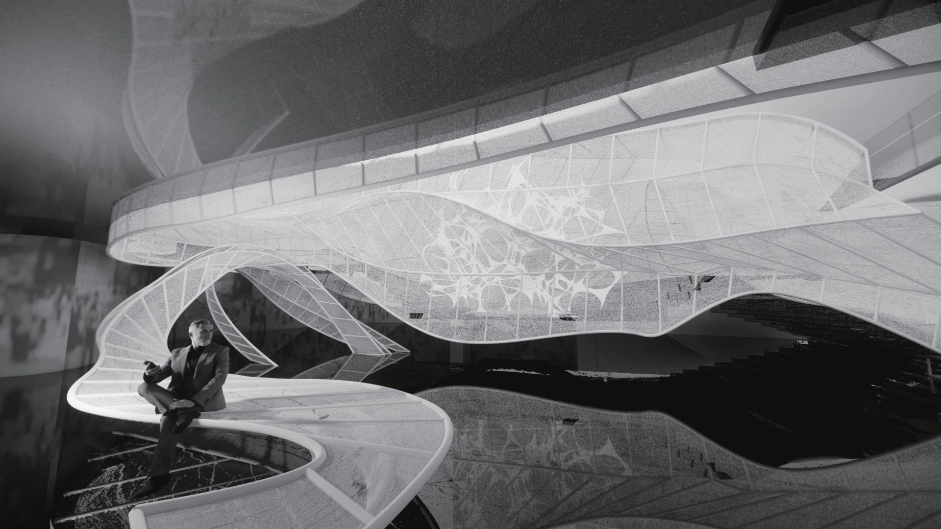 In terms of the construction methods and elements of the space, we use two opposing elements, curved and vertical and horizontal, to shape the space, emphasizing the integration and conflict of nature and artificiality, and interpreting the symbiotic relationship in the imitation ecology with the distortion of the structure as an echo.