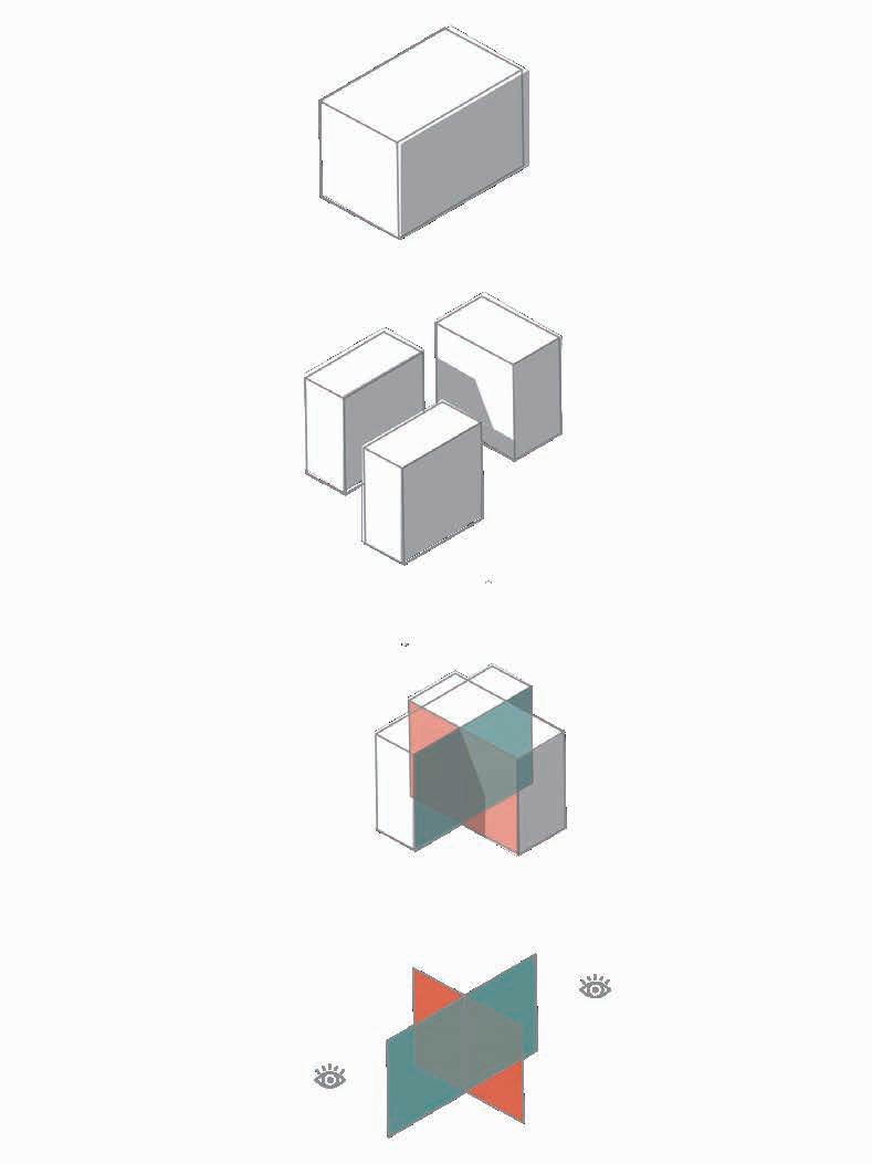 The interspersed spaces make the original one-sidedness of viewing into a multi-faceted one