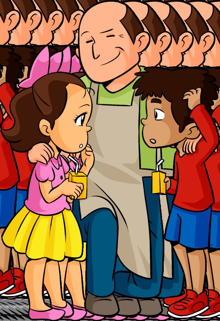 El Señor Petronilo, dueño de la enda que visitan todos los días, los llamó para regalarle un jugo a cada uno. Los niños, con gran emoción, se acercan por el jugo.
