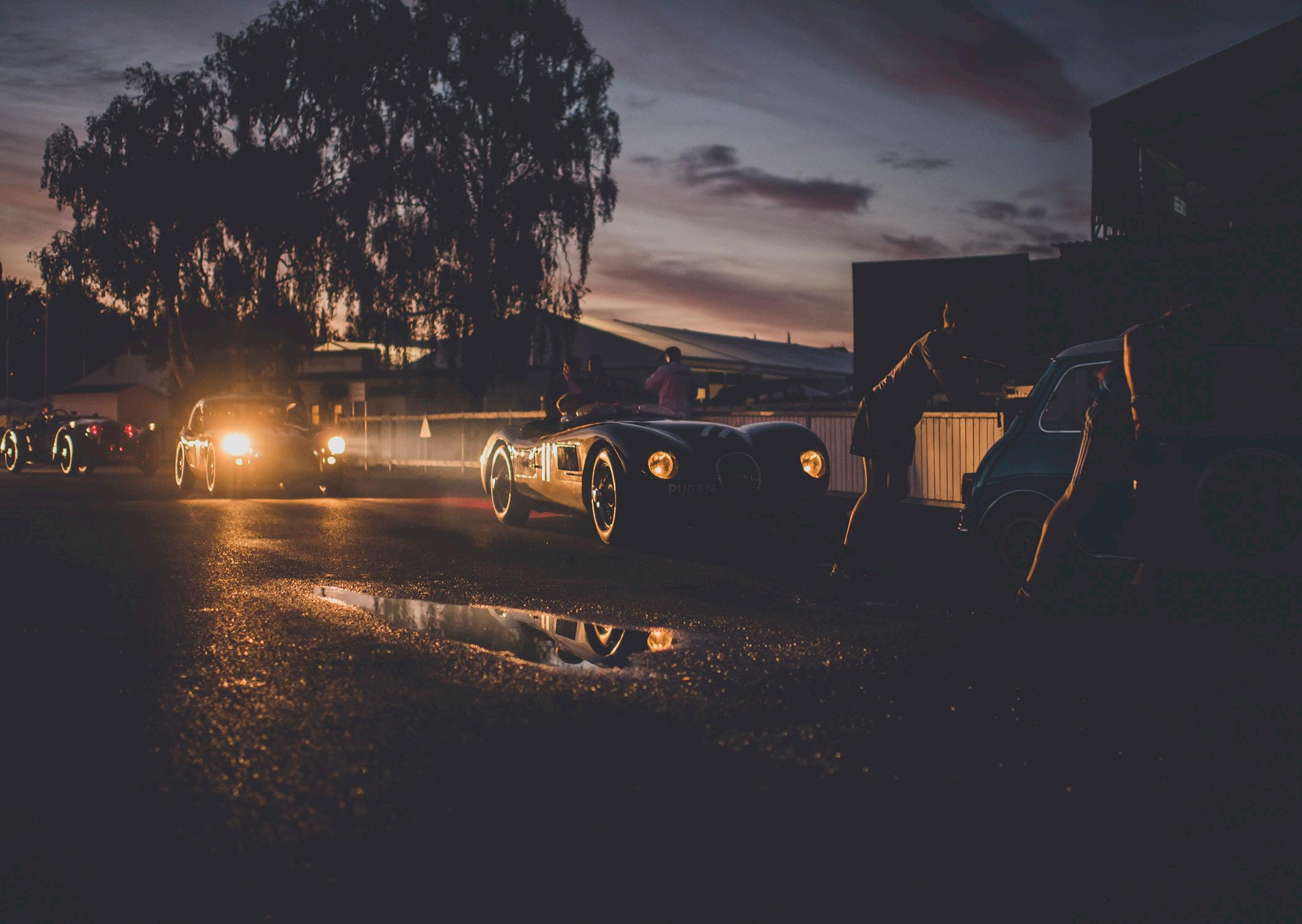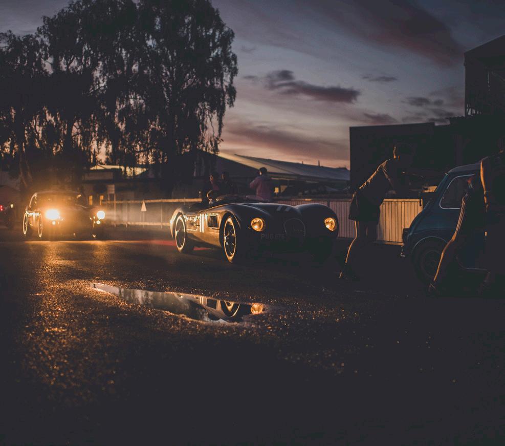 you miss. You can edit the image to feel the way you felt, rather than simply the way the technology in your hands recorded that moment. For this year’s Revival, the images I was excited to edit were the ones I grabbed as I walked towards the exit on the final evening. I keep my cameras swinging from me right until the last moment where I get into my car as there will always be something to photograph in that fading, navy-purple light. Sunday had been grey and wet. The entire circuit was dotted with puddles. It was only as I began walking towards the circuit that I noticed one car has its warm, ageing headlights on which sparkled in a small puddle. ‘That’s pretty’, I thought. As I stood there capturing an array of angles, more cars began to ignite to life and switch on their lights. More puddles. Less daylight. The shots I captured over the brief moment of departure of these cars were by far my favourite of the weekend. In that short moment, I was the lucky one to be in the right place at the right time.