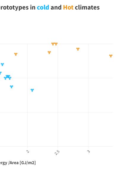 The following graphs present the evaluation of all the optimized houses across different climates. The results tial to highlight a specific focus: the most notable optimization is observed in the houses designed for temperate in terms of energy efficiency and comfort. This trend suggests that the temperate climate provides a favorable