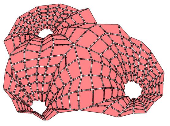 metrics are the evaluation of different conused to analyze the mesh and planar quads materialization of the shape. In this case, focus was on optimizing the number of identical meshes, their degree of planarity, the potential problems in their materialization. Additionally, the similarity these meshes to a square was considered, as well as how close we to achieving the materializaof the initial shape.