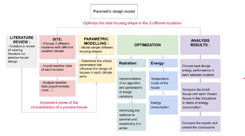 The diagram above illustrates the entire process carried out in this research, from the initial selection of variables to the final simulations. The graphs below detail the energy consumption of each evaluated house, along with their key characteristics, such as thermal performance, natural light distribution, and envelope efficiency. These characteristics are essential as they provide a clear understanding of the critical variables that were modified to optimize the design of the house for each climate zone.