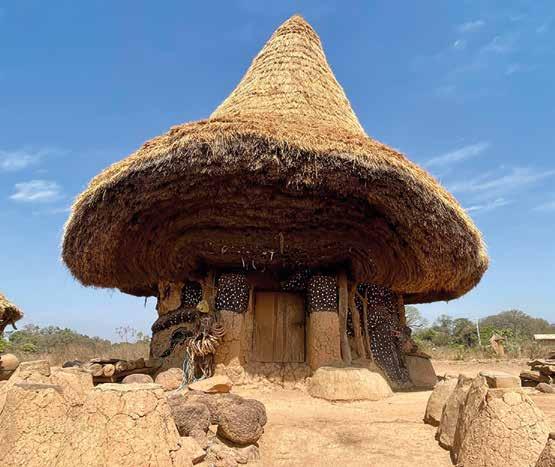 Niofoin is one of the most picturesque villages in Côte d’Ivoire. It is home to Senufo houses and a fetish house adorned with numerous dog collars from sacrificed animals. Its thatched roof is covered with an additional layer every year. Senufo houses are round for women and rectangular for men, built from earth with thatched roofs, and surrounded by granaries.