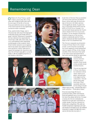 N March 10, Dean Voutsas, a grade 7 student, passed away after a long, noble and courageous battle with cancer. In every aspect of his life at Crescent, Dean personified the mission and values of the School and his loss has significantly touched the whole community.