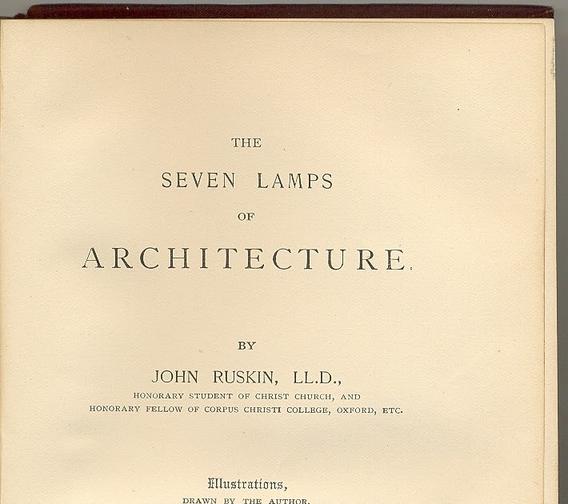 John Ruskin desenvolveu as principais teorias de preservação e restauração de monumentos no livro As Sete Lâmpadas da Arquitetura, publicado em 1849 na Inglaterra, local marcado pelo período do desenvolvimento industrial O livro é divido em sete capítulos, que correspondem ao que o autor chama de as sete lâmpadas (pois iluminariam o pensamento dos arquitetos), ou “leis” que a arquitetura deveria seguir, são elas: Sacrifício, Verdade, Poder, Beleza, Vida, Memória e Obediência, os quais possuem caráter independente.