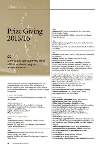 Prizes Awarded The most prestigious of over 200 individual prize-winners this year included: Shell Scholars 2016–17 Academic: Ben Aitchison, Alexander Gallon, Erin Keeling, Joshua Ogbonna, Lara Pennell, Harry Scott-Burt, Millie Shaw. Art: Sadie Aspinall, Millie Shaw. English: Sadie Aspinall, Bianca Booth. Music: Harry Scott-Burt. William Townsend Form Prizes Shells Attainment: Eleanor Baird, Celestine Dal, Benedict Harrison, Adrian Judge, Wenyu Wan. Progress: Rajit Bagga, Maya Koria, Millie McCamley, Alexander Spencer, Harinija Vicnakumaar. 2nds Attainment: Namuum Batkhishig, Charlotte Bull, Alex Cox, Jasmine Harrison, Harry White. Progress: Lily Allison, Mila Bilsland, Theo Cave, Matthew Menashe, William Roche. 10
