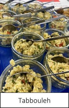 Theonethatthemajorityofpeoplewill recogniseisfalafel,whichareballsorpatties madefromchickpeasorfavabeans,plusfresh herbsandspices,mahalabia(acreamymilk puddingdessertincludingavarietyofflavours ortoppings,buttraditionallyincludesagarnish ofnutsandrosepetals)andtabbouleh,a saladtraditionallymadeofbulgur,tomato, andfinelychoppedparsleyandmint,often includingonionandgarlic,seasonedwitholive oil,lemonjuiceandsalt.
